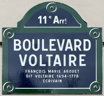 One of the things that stands out about Voltaire is the uniqueness of his life performance. Even his name is a total construct. He was born François-Marie Arouet, but quickly adopted the penname Voltaire. He liked to style himself as an aristocrat named M. de Voltaire. When he died in 1778, he was whisked out of Paris propped up in a carriage wearing a powdered wig so that his nephew could bury him in church grounds, since most church figures abhorred him. His first grave in Sellières was marked XX, with the intertwined initials A and V capturing Arouet crossed with Voltaire. His brain went to the Comédie-Française theatre and his heart was secreted within a seated statue of the philosopher by French sculptor Houdon. Later, in 1791, Voltaire’s remains were twice exhumed and he was finally interred by the Revolutionaries with massive state funeral pomp and ceremony at the Panthéon in Paris, where his grave may be visited today.